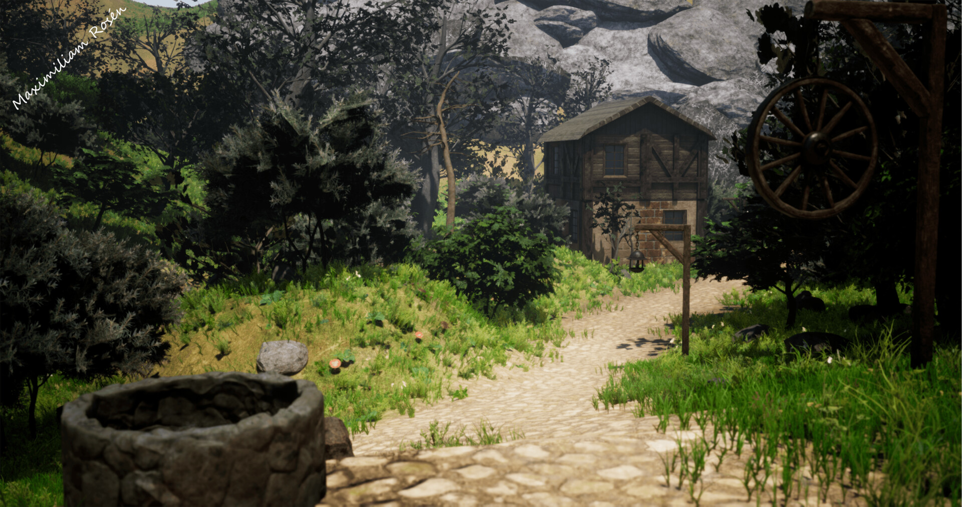 This environment was made inside Unreal where the level design was done by me and some assets hand crafted by med. All house assets was created by me where I created the models inside Maya and created the textures inside Unreal. Vertex paint was used in this scene as well, all other assets was a part of a pack from Unreal.